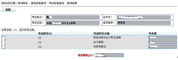 選擇本網站即四川財政會計網(http://221.237.164.66:8080/cms)欄目“會計考試”――“會計從業資格考試”,點擊“網上繳費查詢”,選擇考區,考試名稱,填寫證件號、密碼,如下圖所示: