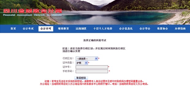 選擇本網站即四川財政會計網(http://221.237.164.66:8080/cms)欄目“會計考試”――“會計從業資格考試”,點擊“取回密碼”,選擇行政區劃,證件類型,填寫證件號、手機號碼(網上報名時填寫的),如下圖所示: