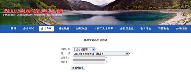 選擇本網站即四川財政會計網(http://221.237.164.66:8080/cms)欄目“會計考試”――“會計從業資格考試”,點擊“受理號查詢”,選擇考區,考試名稱,填寫證件號、姓名,如下圖所示: