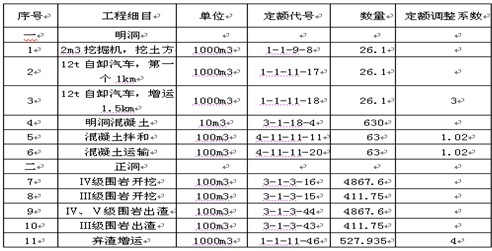 3、土石方采用12t自卸汽車運(yùn)輸,洞外出渣距離2500m;混凝土采用6 m³混凝土攪拌運(yùn)輸車運(yùn)輸,混凝土洞內(nèi)外運(yùn)距均在1km以內(nèi);不計(jì)洞內(nèi)排水、通風(fēng)和拌和站場地及安拆費(fèi)用。