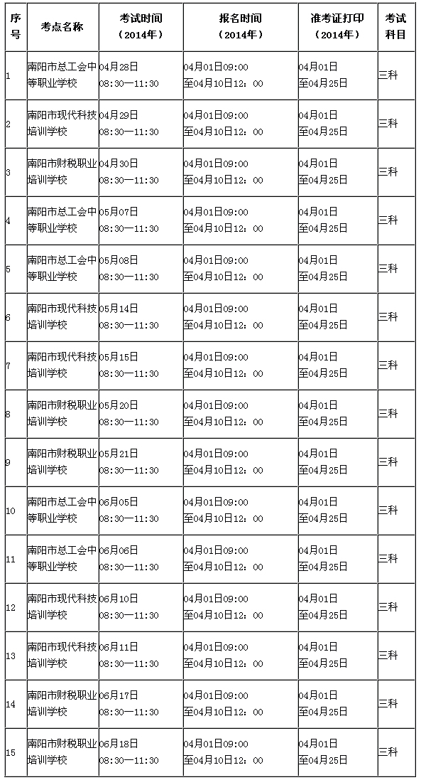 2014年度河南省會計從業(yè)資格考試南陽考區(qū)4-6月考試計劃