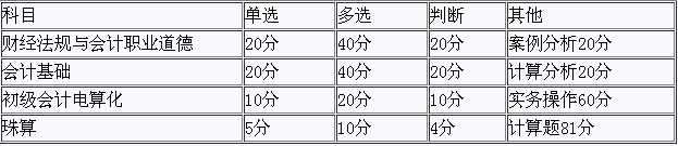會(huì)計(jì)從業(yè)資格無紙化考試各科目滿分均為100分,每科目題型分值如下: