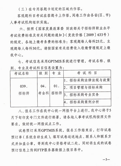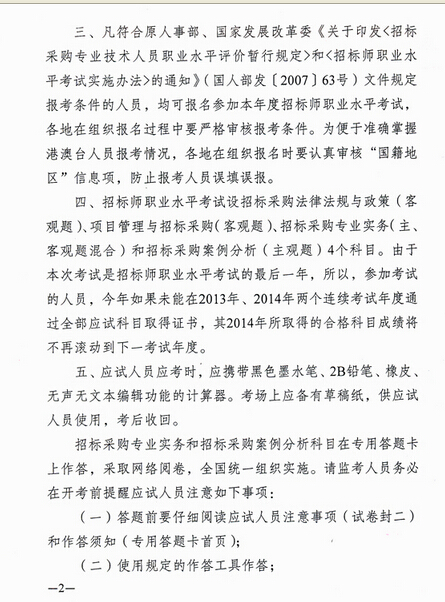 考試科目分別為《招標采購法律法規與政策》、《項目管理與招標采購》、《招標采購專業實務 》、《招標采購案例分析》。由于本次考試是招標師職業水平考試的最后一年,因此,參加考試的人員,今年如果未能在2013年、2014年兩個連續考試年度通過全部應試科目取得證書,其2014年所取得的合格科目成績將不再滾動到下一考試年度。