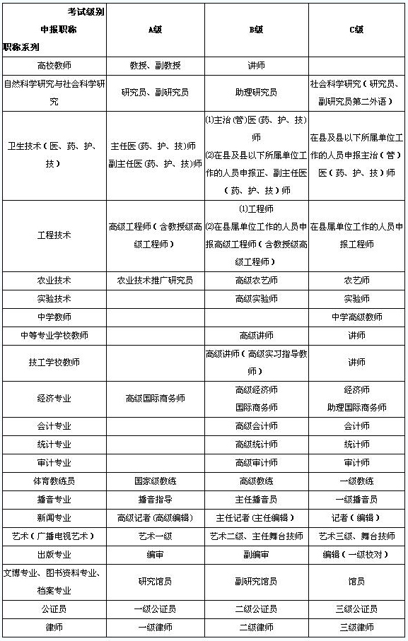 全國專業技術人員職稱外語等級統一考試級別劃分及適用范圍