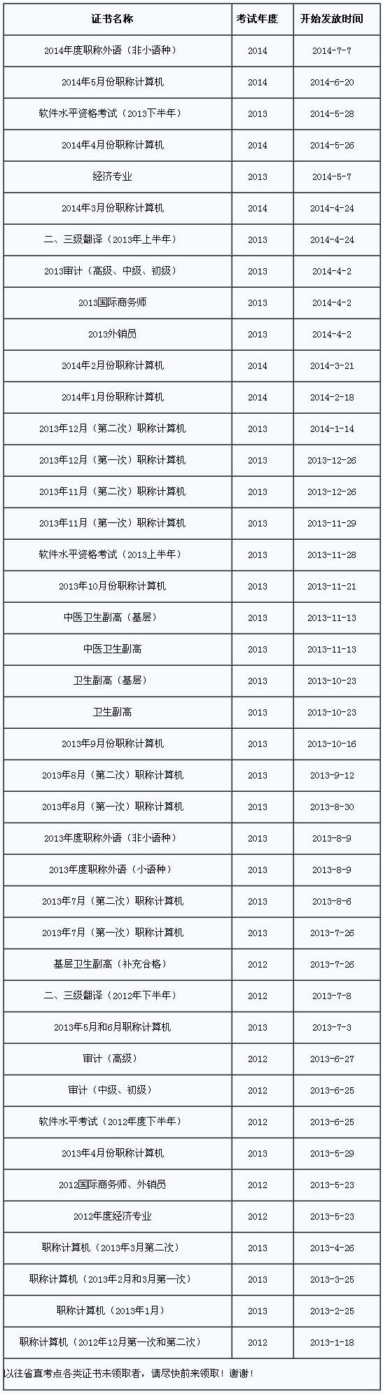全國計(jì)算機(jī)應(yīng)用能力考試(1-12月份)、全國職稱外語考試、衛(wèi)生專業(yè)副高級考試、計(jì)算機(jī)技術(shù)與軟件(水平)考試、審計(jì)專業(yè)、經(jīng)濟(jì)專業(yè)、國際商務(wù)師、外銷員、二、三級翻譯資格(筆譯),具體開始發(fā)放時間請看列表公布的動態(tài)通知。
