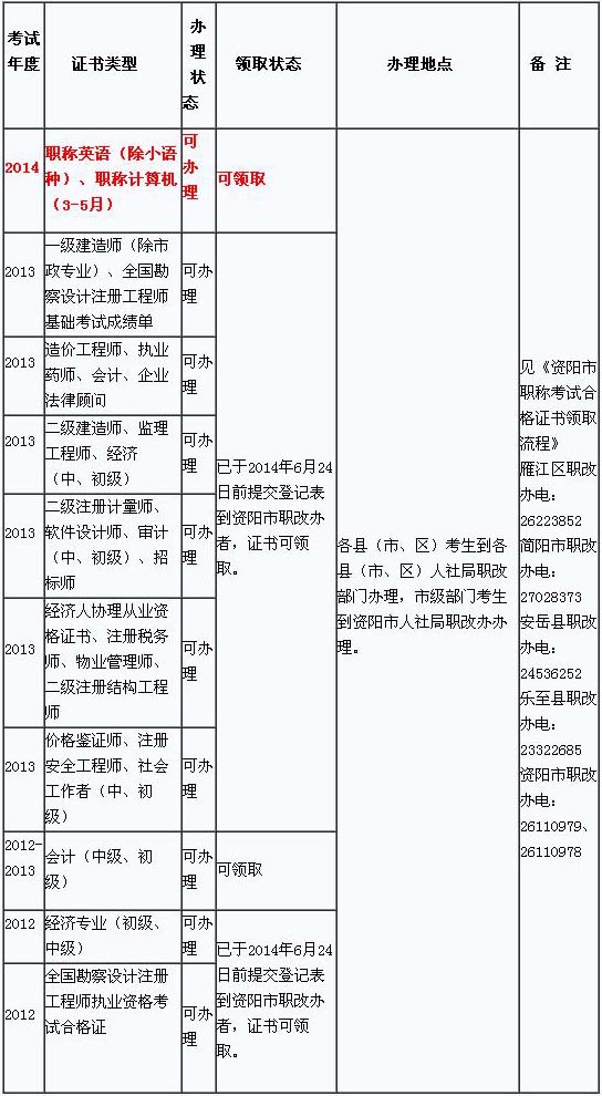 在四川人事考試網(wǎng)報(bào)名時(shí)所選考區(qū)為資陽的職稱考試合格人員(成績(jī)公布在四川人事考試網(wǎng)),請(qǐng)查閱下表,按《資陽市職稱考試合格證書領(lǐng)取流程》辦理證書。