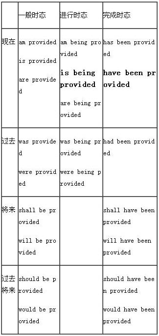 被動語態是由be (助動詞)+過去分詞(及物動詞)構成。be隨主語的人稱、時態和數的不同而變化。現將被動語態的各種時態形式列表如下(以provide為例)