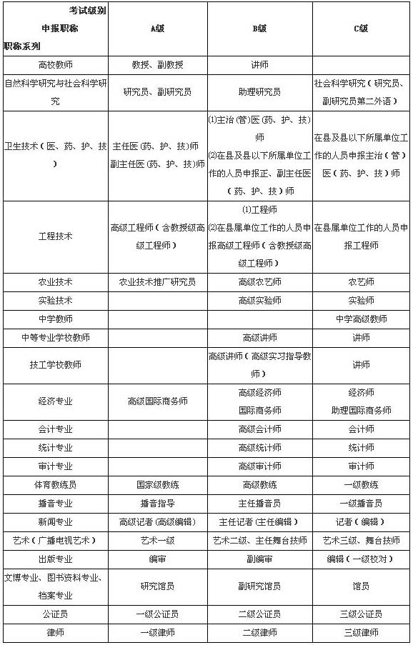 全國專業(yè)技術(shù)人員職稱外語等級統(tǒng)一考試級別劃分及適用范圍