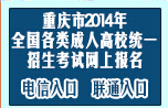 重慶市2014年成人高考網上報名入口已經開通,請重慶市考生點擊下面圖片進入重慶教育考試院網站綠色通道欄成人高考報名入口》》