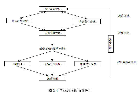 企業經營戰略管理的全過程可以概括為三個階段,即經營戰略分析、經營戰略形成、經營戰略實施與控制(圖2-1)。這三個階段互相銜接,形成了企業經營戰略管理的有機整體,也體現了企業經營戰略管理的動態過程。