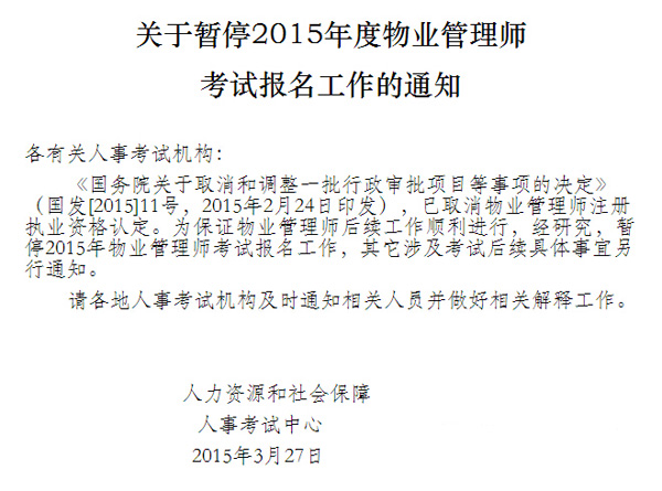 有些省份已經公布了2015年物業管理師報名工作暫停的通知,通知一出,各方慌亂,小編下面就為大家解讀相關事宜,希望大家都能理性看待此事。
