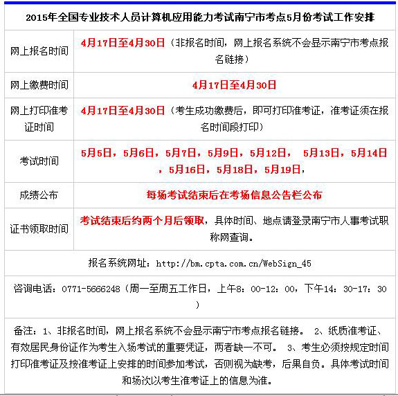 摘要 2015年5月南寧職稱計算機考試報名時間:4月17日-4月30日,準考證打印時間:4月17日-4月30日。