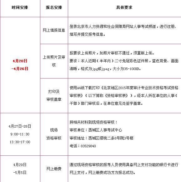 (一)非首次報考人員須于2015年4月20日至5月5日登錄北京市人力資源和社會保障局網站(網址:www.bjrbj.gov.cn,下同)人事考試頻道,按照系統的要求直接辦理網上報名和網上繳費手續,網上繳費成功方為報名成功。