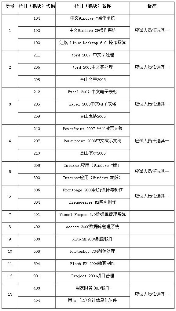 (一)考試科目(模塊)分為13類,共24個(見附件1)。