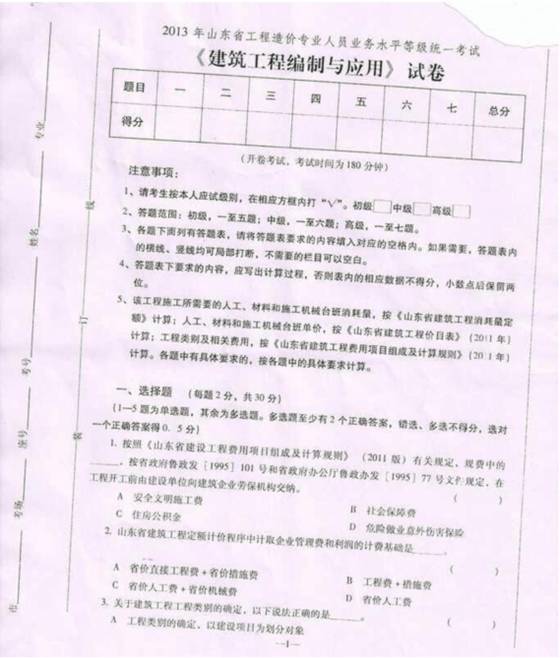 山東2013年造價員考試《建筑工程編制與應(yīng)用》真題