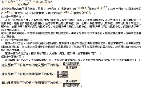 選取了可比實(shí)例之后,應(yīng)先對(duì)這些可比實(shí)例的成交價(jià)格進(jìn)行換算處理,使其之間的口徑一致、相互可比,并統(tǒng)一到需要求取的估價(jià)對(duì)象的價(jià)格單位上,為進(jìn)行后續(xù)的比較修正建立共同的基礎(chǔ)。