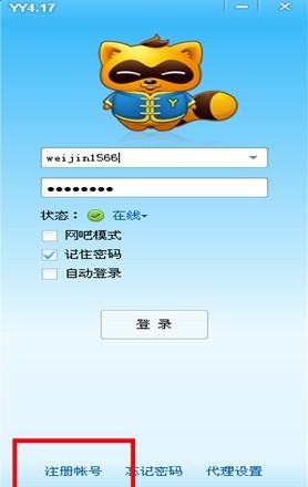 6、安裝完成后彈出yy列表,請點擊左下角“注冊賬號”