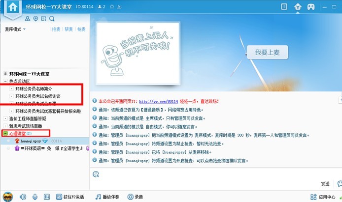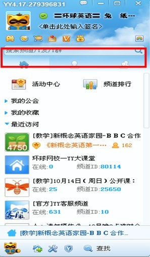 登陸后,在標紅搜索框中,搜索頻道:10956745,并進入“環球網校-yy大講堂”,進入后雙擊“心理講堂”,即可進入直播。進入頻道后,還可以點右上角的五星☆進行收藏。
