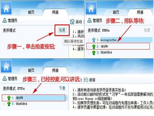 (1)、 搶麥 管理員將頻道模式變為麥序模式,學員可發言講話; 步驟一:點擊搶麥按鈕,進入麥序隊列; 步驟二:排隊等待發言;步驟三:已經控麥,可以講話。