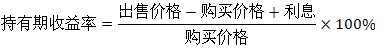 持有期收益率:是債券買賣價(jià)格差價(jià)加上利息收入后與購(gòu)買價(jià)格之間的比率