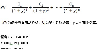 到期收益率:是指投資購(gòu)買債券的內(nèi)部收益率,即可以使投資購(gòu)買債券獲得的未來(lái)現(xiàn)金流量的現(xiàn)值等于債券當(dāng)前市場(chǎng)價(jià)格的貼現(xiàn)率。