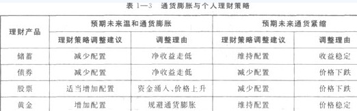 表1―3列出了通貨膨脹對個人投資理財策略產生影響的不同情況。由于通貨膨脹(或通貨緊縮)根 據其嚴重程度可區分為多種不同情形,而且對具體產品的影響也比較復雜,需要結合其他各方面情況才 可以作出符合實際的具體判斷。故,表中的分析建議,僅供參考,實際理財過程中還需要更加細致的綜合判斷。