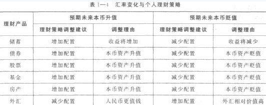 表1―4列出了匯率變化對個人投資理財策略產生影響的不同情況,表中的分析建議僅供參考。