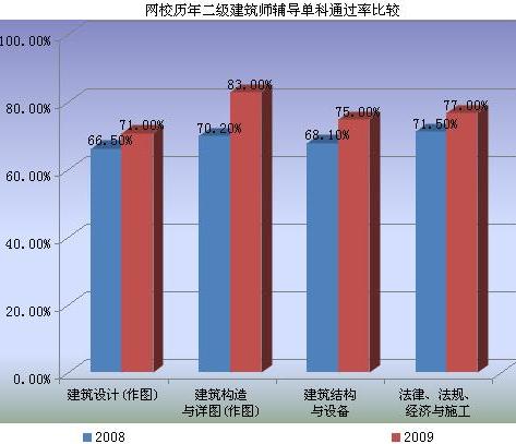 網校2009年二級建筑師四科目與2008年的網校二級建筑師四科目輔導通過率進行比較。其中《場地與建筑設計》較2008年的66.5%提高4.5%;《建筑構造與詳圖》較2008年的70.2%提高12.8%;《建筑結構與設備》較2008年的68.1%提高6.9%;《法律、法規、經濟與施工》較2008年的71.5%提高5.5%。