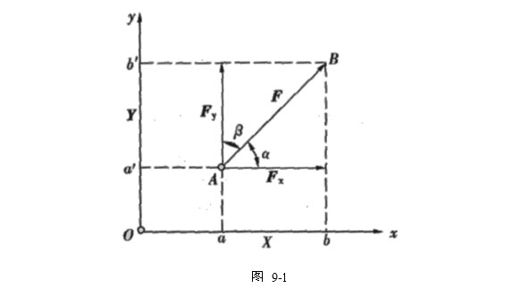 過力矢F的兩端A、B,向坐標軸作垂線,在坐標軸上得到垂足a、b,線段ab,再冠之以正負號,便稱為力F在坐標軸上的投影。如圖9-1中所示的X、Y即為力F分別在x與y軸上的投影,其值為力F的模乘以力與投影軸正向間夾角的余弦,即: