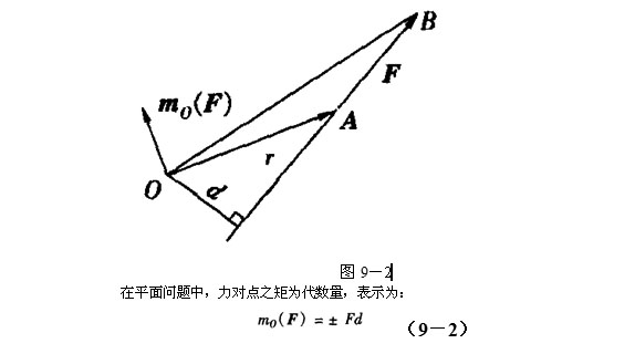 式中d為力到矩心O的垂直距離,稱為力臂。習慣上,力使物體繞矩心逆時針轉動時,(9-2)式取正號,反之取負號。