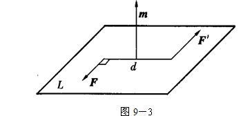 大小相等、方向相反、作用線平行但不重合的兩個力組成的力系,稱為力偶。用符號(F,F')表示。如圖9-3所示。圖中的L平面為力偶作用平面,d為兩力之間的距離,稱為力偶臂。