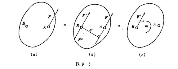 如圖9―5所示,在B點加一對與力F等值、平行的平衡力,并使F=F'=―F'',其中F與F''構成一力偶,稱為附加力偶,其力偶矩m=Fd=mB(F)。這樣,作用于A點的力F與作用于B點的力F,和一個力偶矩為m的附加力偶等效。由此得出結論:作用于剛體上的力F可平移至體內任一指定點,但同時必須附加一力偶,其力偶矩等于原力F對于新作用點B之矩。這就是力的平移定理。