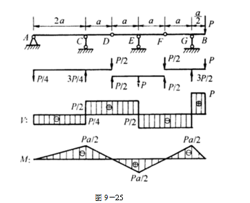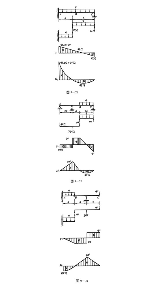 受力分析時要從中間鉸鏈處斷開,首先分析比較簡單的附屬部分,然后分別按單跨靜定梁處理。如圖9-X、圖9-23、圖9-24、圖9-25所示。