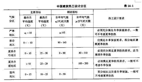 我國幅員遼闊。地形復雜,各地由寸:緯度、地勢和地理條件的不同,氣候差異懸殊.不同的氣候條件對房屋建筑提出的要求不同,為使建筑能夠充分地利用和適應本地的氣候條件,我國各地氣候作如下劃分(表14-1),在進行設(shè)計時,應滿足不同的熱工設(shè)計要求。