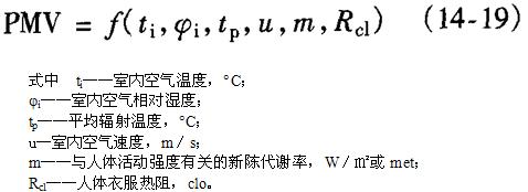 PMV指標是在丹麥工業大學微氣候實驗室和美國堪薩斯州立大學環境實驗室做了大量試驗工作后,由丹麥學者房格爾教授(P.0.Fanger)提出的,是迄今為止考慮人體熱舒適感諸多有關因素最全面的評價指標,于20世紀印年代初得到國際標準化組織ISO的承認。PMV指標與評價方法包括PMV指標與預測不滿意百分率PPD兩方面的內容。它是以房格爾教授的熱舒適方程為基礎,導出PMV指標與影響人體熱舒適的6個要素之間的定量關系,即:
