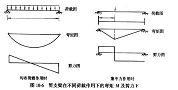 (1)簡支梁在不同荷載作用下的彎矩M及剪力V(圖10-6);