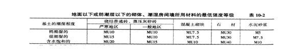 5.地面以下或防潮層以下的砌體,潮濕房間的墻,所用材料的最低強度等級應符合表10―2的要求。