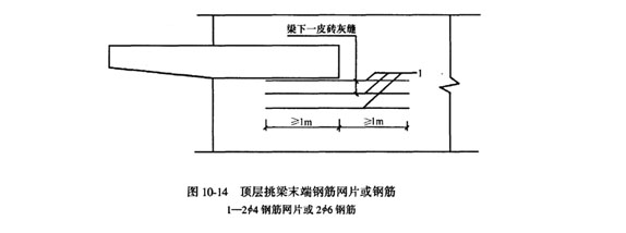 (6)頂層挑梁末端下墻體灰縫內設置3道焊接鋼筋網片(縱向鋼筋不宜少于2φ4,橫 筋間距不宜大于