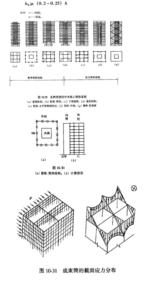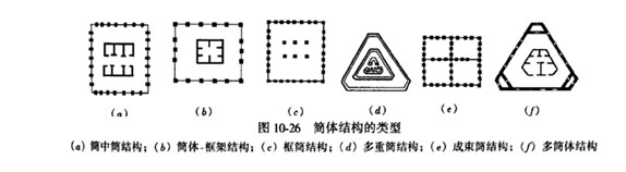 2.簡體―框架結構[圖10-26(b)],亦稱框架―核心筒結構,由中央剪力墻核心筒和周邊外框架組成;
