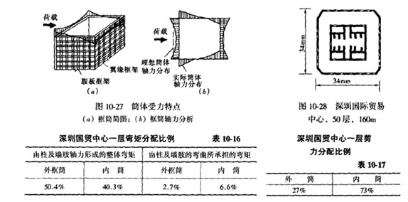 1.筒中筒結構――由中央剪力墻內筒和周邊外框筒組成;框筒由密柱(柱距