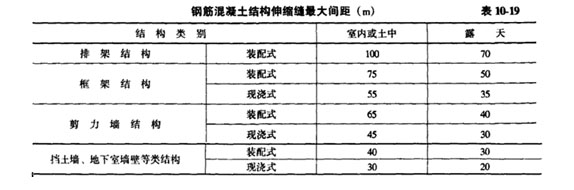 1.為防止由于溫差和混凝土干縮引起鋼筋混凝土的開裂,應在結構中設置伸縮縫,鋼筋混凝土結構伸縮縫的最大間距宜符合表10-19的規定。