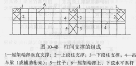 (1)在吊車(chē)梁以上至屋架下弦問(wèn)設(shè)置的上段柱的柱間支撐,以及當(dāng)為雙階柱時(shí)在上下兩層吊車(chē)梁之間設(shè)置的中段柱的柱間支撐;