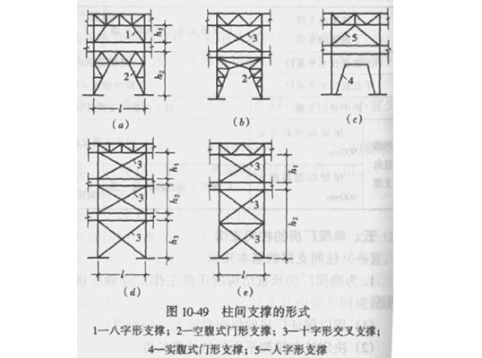 (6)十字形交叉支撐由于構(gòu)造簡(jiǎn)單,傳力直接,用料省,并且剛度較大,所以是常用的一種形式。門(mén)形支撐由于構(gòu)造較復(fù)雜,用料較多且剛度較差(如空腹式門(mén)形支撐),所以只在特殊需要時(shí)采用。