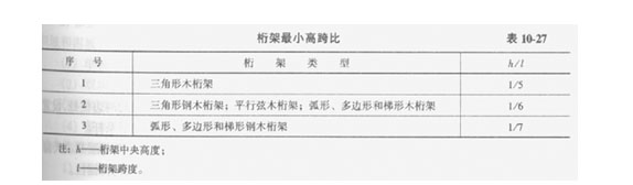 4,桁架的形狀:一般為三角形,也可采用梯形、弧形和多邊形屋架。屋架中央高度與跨度之比,不應小于表10-27規定的數值。桁架應有約為跨度1/200的起拱。
