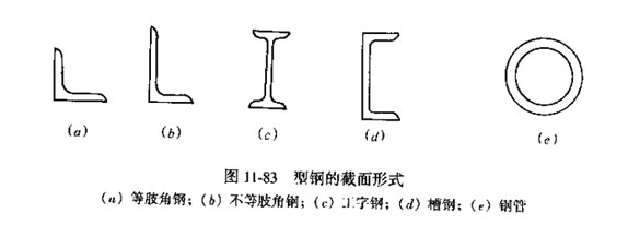 型鋼可以直接用作構件,以減少加工制造工作量,在設計中應優先選用。常用的型鋼有:角鋼、槽鋼、工字鋼和鋼管(圖11-83)。