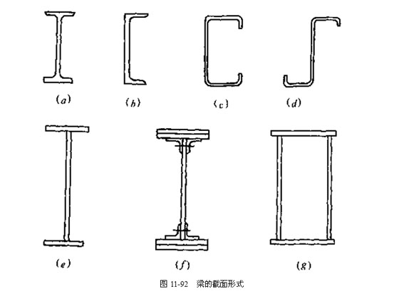 組合梁由鋼板用焊縫或鉚釘或螺栓連接而成。其截面組織較靈活,可使材料在截面上的分布更為合理,用料省。用三塊鋼板焊成的工字形組合梁(圖11―92e),構造簡單、制作方便,故應用最為廣泛。承受動荷載的梁,如鋼材質量不滿足焊接結構要求時,可采用鉚接或高強度螺栓連接(圖11