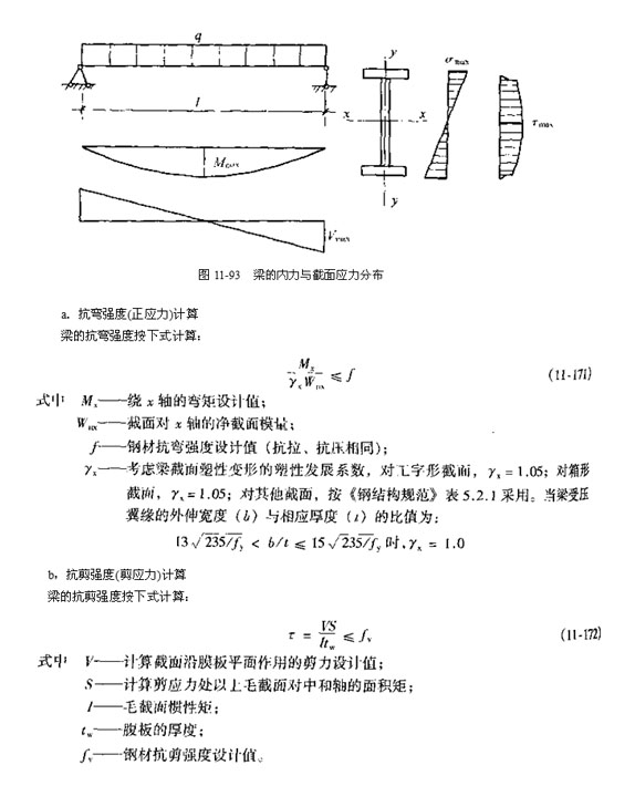 梁在橫向荷載作用下,在其截面中將產生彎曲正應力和剪應力(圖11-93),梁的截面通常由抗彎強度和抗剪強度確定。