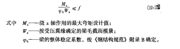 如圖11-94,梁在最大剛度平面內(nèi)彎曲(繞x軸彎曲),當受壓翼緣的彎曲應(yīng)力達到某一值后,就會出現(xiàn)平面的彎曲和扭轉(zhuǎn),最后使梁迅速喪失承載力,這種現(xiàn)象稱梁喪失整體穩(wěn)定。梁喪失整體穩(wěn)定寸的荷載一般低于強度破壞時的荷載,且失穩(wěn)破壞是突然發(fā)生的,危害性大:因此,除計算梁的強度外,還必須驗算其穩(wěn)定性,穩(wěn)定計算公式為: