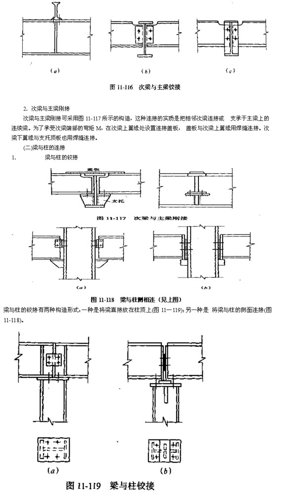 次梁與主梁鉸接從構造上可分為兩類:一類如圖11-116(a)所示的疊接,次梁直接放在主梁上,并用焊縫或螺栓連接。疊接需要的結構高度大,所以應用常受到限制。另―類是如圖11―116(b)、 (c)所示主梁與次梁的側向連接。這種連接可以減小梁格的結構高度,并增加梁格剛度,應用較多。圖11―116(b)為次梁借助于連接角鋼與主梁連接,連接角鋼與次梁采用螺栓和安裝焊縫相連。圖11-116(c)的構造是將次梁用螺栓或安裝焊縫連接于主梁的加勁肋上。