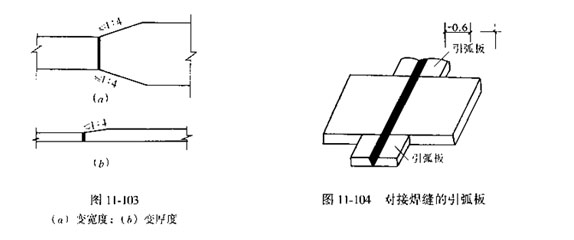 2)在對接焊縫的拼接處:當焊件的寬度不同或厚度相差4mm以上時,應分別在寬度方向或厚度方向從一側或兩側做成坡度不大于1/4的斜角(如圖11-103)。